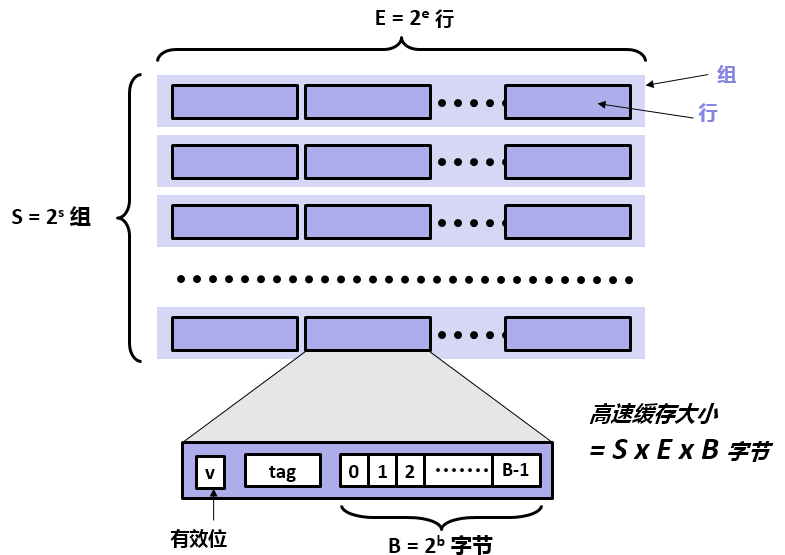 一般而言,高速缓存的结构可以用元组(S,E,B,m)来描述。高速缓存的大小(或容量)C指的是所有块的大小的和。标记位和有效位不包括在内 。因此,C=S×E×B。
