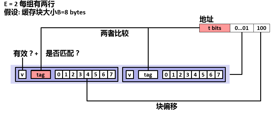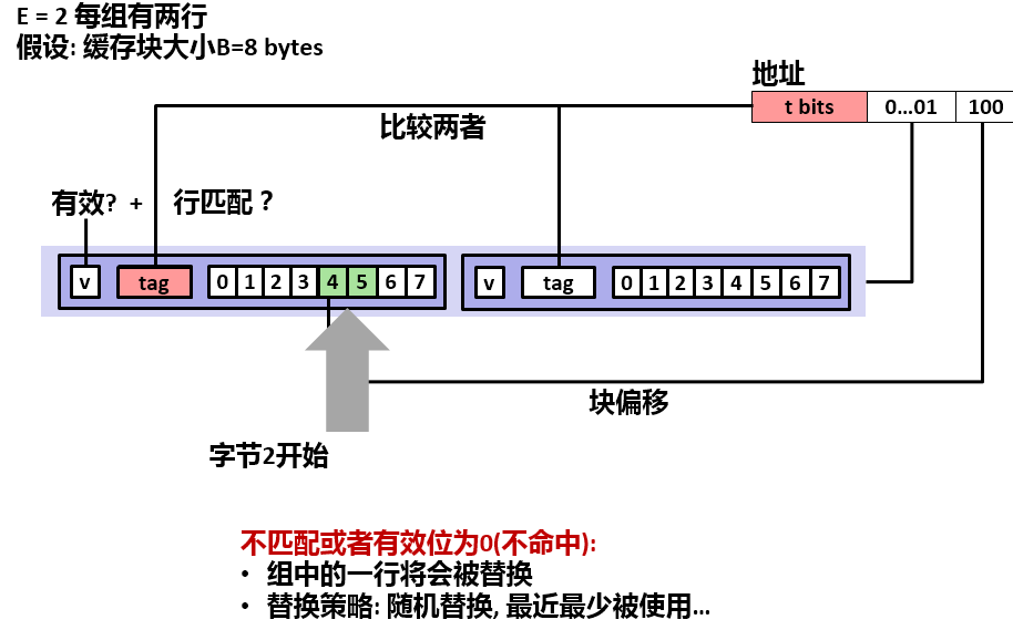 行匹配:根据地址划分,可得到t位的标志位,由于组内的任意一行都可以包含任意映射到该组的数据块,所以就要线性搜索组中的每一行,判断是否有和标志位匹配且设置了有效位的行 ,如果存在,则缓存命中,否则缓冲不命中。