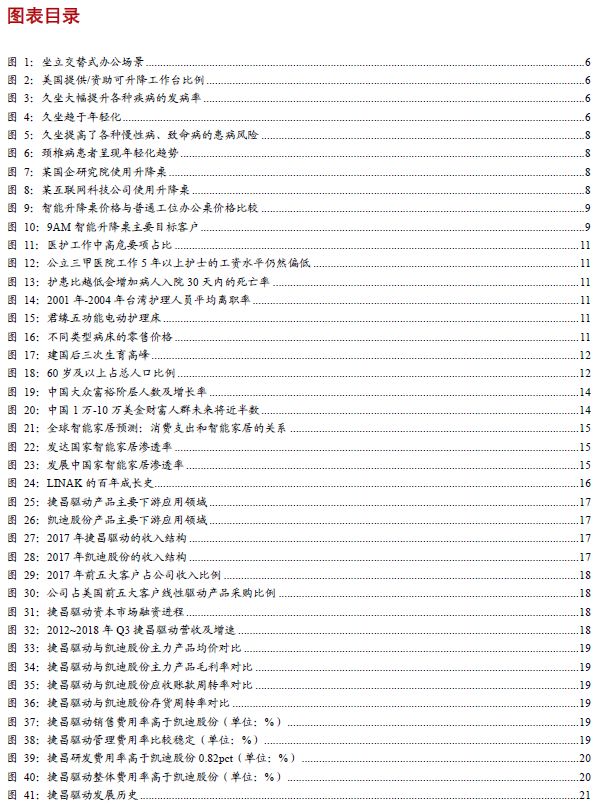 国内主要竞争对手是台湾的TIMOTION 和凯迪股份。TIMOTION为非上市公司,目前在东莞有工厂,江苏昆山有分公司,在日本、韩国、法国和意大利均有办事处,产品主要应用于医疗、家具、办公及工业领域,具有较强的产品开发能力,全球市场拓展态势良好。凯迪股份目前正处于IPO排队过程中,2018年上半年营收5.52亿元;捷昌驱动2018年前三季度收入7.36亿元。我们预计二者2018年收入规模相当,均超10亿的规模。捷昌驱动与凯迪股份的线性驱动产品在下游应用领域存在一定的结构性差异。以2017年营业收入为例,捷昌驱动80%收入来自智慧办公驱动系统(智能升降桌),18%收入来自医疗康护驱动系统,2%收入来自智能家居控制系统;与之相反,凯迪股份2017年收入中73%来智能家居驱动系统(功能沙发、按摩器),22%来自智慧办公驱动系统(智能升降桌)、4%来自汽车尾门驱动系统、1%来自医疗康护驱动系统。捷昌驱动在智能办公和医疗康护领域优势明显,而凯迪股份则在智能家居和汽车尾门驱动领域具备优势。