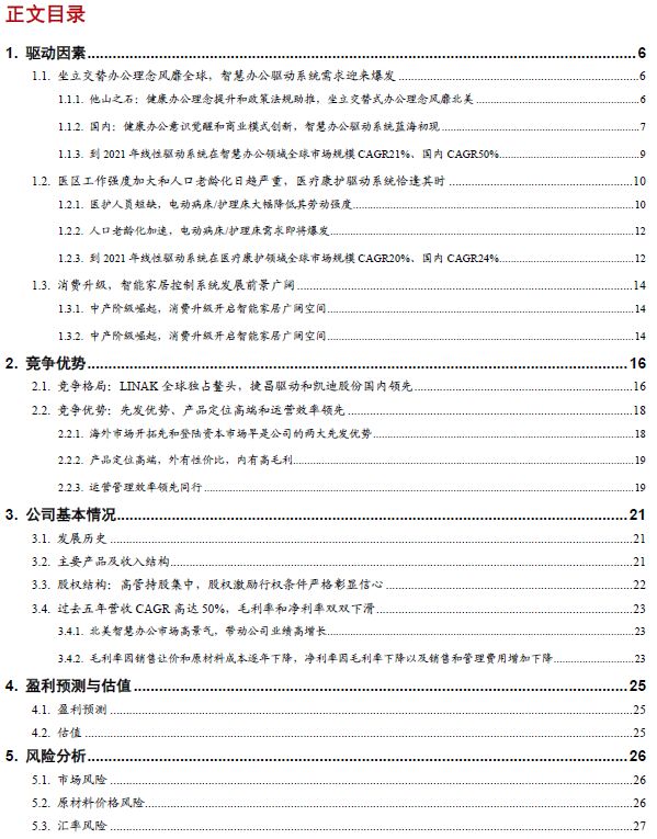 1)随着久坐危害和健康办公理念日益深入人心,线性驱动产品在全球智能升降桌市场规模到2021年将达到81亿元,CAGR为21%;国内将达到17亿元,CAGR为50%。目前北美智能升降桌渗透率约20%,而国内渗透率不到1%;2)随着护工劳动强度加大和人口老龄化加速,预计线性驱动产品在全球电动病床/护理床的市场规模到2021年将达到83亿元,CAGR为20%;国内将达到13亿元,CAGR为24%。目前发达国家基本实现了病床的电动化,而国内目前的渗透率仅在3%~5%;3)StrategyAnalytics预测到2023年全球智能家居市场复合增速10%,2018年发达国家智能家居渗透率普遍超过15%,而金砖国家渗透率普遍不到5%。其预测到2021年发达国家智能家居渗透率普遍会超过30%。