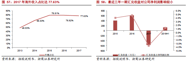 2017年,公司海外收入占比已经达到了78%,海外结算货币主要为美元,因此每年会面临着汇率波动的风险。但是由于公司严格的收款政策和汇率风险管控措施,导致每年汇兑损益的对净利润影响并不大。在外销市场,公司通常要求新客户在签订订单时预付全部的货款,对于重要的战略性客户,公司通常给予1-2个月左右的账期,其余客户公司会要求对方在签订销售订单时按照一定的比例预付部分货款。为避免原材料价格及汇率波动对公司盈利能力可能产生的重大影响,公司主要采取成本加成的定价策略,并通过签订远期外汇协议等在一定范围内锁定汇率。但是随着公司收入规模的不断扩大,海外资产越来越多,公司仍然面临着一定的汇率风险。