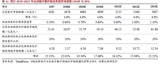 根据市场医疗保健研究机构卡洛拉马(Kalorama Information)研究公司分析,2014 年全球医疗器械市场规模为3610 亿美元,2015 年全球医疗器械市场规模为3810 亿美元;根据TrendForce 数据显示,2017 年全球医疗器械市场规模为4281 亿美元,预期到2023 年可达5607亿美元,即2017 年-2023 年期间全球医疗器械市场规模将保持4.60%的复合年均增长率。按电动病床和护理床占医疗器械设备市场规模0.50%~1.1%来测算,2017 年全球电动病床和护理床市场规模约为21.40 亿美元。预计到2020年全球电动病床和护理床市场规模为61.7亿美元。目前线性驱动系统占电动病床或护理床的比例为20%,据此我们可以推算到2021年线性驱动产品在电动病床或护理床市场规模为9.22亿美元(约62亿元),2018~2021年CAGR为20%。