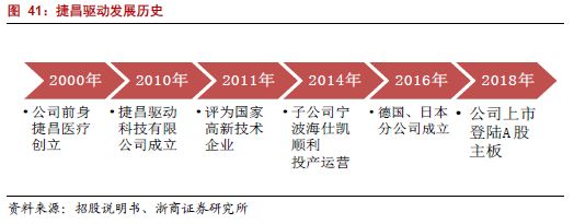 捷昌驱动(603583)成立于2010年,是国内线性驱动行业领先企业,国家级高新技术企业和直流电动推杆国家行业标准起草单位。公司前身是2000年成立的捷昌医疗。2014年,公司首先在新三板挂牌上市,期间完成三轮定增募资,于2018年9月登陆A股主板。公司掌握线性驱动产品自主研发、生产和销售的一体化流程能力,主要产品包括控制器、立杆、推杆等,广泛应用于下游医疗康护、智慧办公、智能家居等领域(例如:电动办公桌、ICU电动病床)。