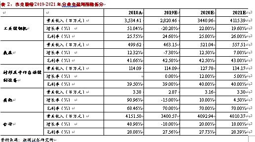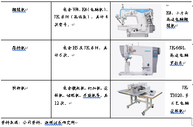 盈利预测及估值 我们预测公司2019~2021年主营收入分别为34.01亿元、40.93亿元和48.10亿元,同比增速为-18%、20%、18%;实现归母净利润为3.42亿、4.32亿、5.77亿元,同比增长-24.67%、26.32%、33.56%,实现每股收益1.11元、1.40元、1.88元,对应2019-2021年的PE为20倍、16倍和12倍。 投资建议 宏观经济景气度下行导致的下游服装行业投资下降、原材料成本上升(主要为钢材)、美元汇率波动等风险。 [报告正文] 1. 寡头格局打造全球缝制设备行业头把交椅1.1. 杰克股份是国内缝制机械行业龙头企业公司于2003创建于我国缝制设备制造之都浙江台州,多年来始终专注于工业缝制机械的研发、生产和销售。主营缝纫机、裁床、电机业务,现有产业布局包括台州、临海、上海,以及德国(奔马)和意大利(迈卡)。 2008年,通过入股浙江众邦,逐步实现原材料电机电控的自给;2009年,通过收购德国奔马,公司介入业务。2017,18年杰克通过并购意大利迈卡,德国威比玛,进一步丰富了杰克的自动化、智能化产品品类,扩大智能缝制的版图。2017年1月,杰克股份在上交所主板挂牌上市。 杰克于2010年起稳居工业缝纫机销量全球第一,2014年底销售额攀升至全球第二。 自2015年来,公司始终保持高于行业的增长,连续超越飞跃、标准、中捷,市占率年提升2到3个百分点。 2018年,杰克股份实现营业收入41.52亿元,销售额和销售量均超过日本重机,一举成为全球最大的缝制设备企业,裁床技术领先全球。 1.1.1. 公司立足中端,拓展中高端,兼顾中低端。缝制机械按照工序先后分类,主要包括三大类:缝前设备、缝中设备、缝后设备。缝前设备主要包括裁床、铺布机等用于裁剪、安置布料等缝纫工序的加工设备;缝中设备主要包括平缝机、包缝机、绷缝机和特种机等用于正式缝纫工序的设备;缝后设备主要包括熨烫、包装设备等用于熨烫、包装等产品生产后工序的机械设备。 公司主要生产缝前缝中设备,产品包括工业用缝纫机、裁床、衬衫及牛仔缝制设备业务,产业布局包括台州、临海、上海、德国、意大利。 -工业缝纫机业务主要有三大系列:平缝机、绷缝机、包缝机,以及模板机系列。每个系列又可按驱动配置的不同分为电脑车、直驱车和普通车。 -裁床业务主要由德国奔马构成,中国临海基地同步生产经营,中德基地产值规模相当。 -意大利迈卡作为全球衬衫缝制机械专家,解决国内需求痛点,VB M威比玛专业生产牛仔服装自动化设备。 在日本重机占据中高档缝机市场龙头地位的情况下,杰克将目光瞄向了中小型客户。2018年,前五名客户销售额41,862.91万元,仅占年度销售总额10.08%。杰克的售后服务通过一级、二级经销商、分销商,进行培训、覆盖客户,做到快速服务100%,快速响应中小客户对维修的需求,解决中小客户痛点。在立足于中低端市场的同时,杰克积极投入研发,拓展中高端市场。杰克股份每年发明专利数远超同行,连续五年位居行业第一,其中研发专利总量超过了日本重机、兄弟公司和日本飞马的总和。 1.1.2. 股权结构1.2. 行业下行趋缓,公司触底回暖将先于同行1.2.1. 公司三季报业绩环比边际改善,经营状况趋稳。2019年1-9月,杰克股份经营性现金流量为2.42亿元,同比上涨463%,与2018年底负流量相比,已大幅改善。短期借款增加2亿系杰克母公司向子公司提供承兑汇票,而子公司通过此类承兑汇票进行银行贴现,得到现金后将现金支付给供应商,提高资金利用效率,保证供应商收到现金。公司货币现金,交易型金融资产与其他流动资产共计10.11亿元,现金流充足。 公司自2011年来,公司应收账款与存货周转天数近年来在持续下降,公司经营状况不断改善。相较国内同行业公司相比,杰克的周转天数占据明显优势。全球竞争对手,日本重机2018年1-6月的存货周转天数也达到217天,将近为杰克股份的两倍。更短的存货周期使得杰克能更快适应市场的变革,降低存量风险。 1.2.2. 公司盈利能力显著优于同行业水平 经济下行预期加上贸易战不确定变数,导致下游客户对加大投资维持观望情绪,缝纫设备行业自18年下半年进入下行周期,目前判断已经基本触底,预计2019年设备行业销量整体下滑达25-30%,2020年将呈现前低后高态势,全年大概率能实现正增长。公司下游服装行业去年出口下降4-5%,设备国内外需求受经济影响整体下降,但出口影响相对略小。公司下滑幅度小于行业,在行业企稳过程中公司也将率先于行业复苏。 杰克自2016年以来始终保持了较高的增长速度, 2018年营收已超出2015年两倍。自2018年来,随着行业景气度下降,行业内企业主动减产减员的趋势下,公司基本维持了稳定收入。杰克缝纫的出货量在过去三年从80万(2016年)到140万台(2017年)再到210万台(2018年),2019年估计下滑10%,裁床销量相对平稳今年没下滑。公司自2019年三季度盈利环比出现边际改善,经营状况趋稳环比下滑幅度收窄,预计四季度将实现净利润同比转正,迎来业绩拐点,2020年先于行业重回较快增速。 1.3. 逆势新增产能布局,厚积薄发自上市以来,公司的产能扩张主要由三部分组成:募投项目、台州装备制造基地以及兼并收购的外部产能。杰克股份在上市时披露的工缝机最大产能约为87万台。截至2018年底,杰克股份募资的拟扩产100万台工缝机项目完成进度达92.38%。 2018年10月份,杰克股份发布公告规划建设杰克智能高端缝制装备制造基地: 第一期项目规划总投资11.15 亿元,用地