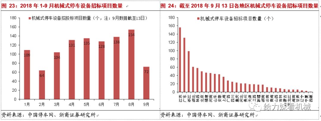 今年以来,停车项目招投标数量持续高速增长,项目规模再创新高,同时智能化高端化程度不断提升。今年上半年,中国停车网共发布停车行业公开招投标项目3,308条,其中机械式立体车库招投标项目1,208条,在去年同期高增长的基础上再增长5.04%。从招标项目数量来看,今年以来单月份机械式停车设备招标项目数量逐渐增加,已从前三月份月均100个左右增长至8、9月份月均150个左右。在地区分布方面,各地区差异也较大,总体而言,经济发展程度越高、人口密度越大的地区立体车库招标项目越多。在单项目金额方面,上半年深圳怡丰中标的“河南省人民医院地下智能停车及综合开发项目”中标金额高达3,945.96万元,已超过去年全年单项目最高中标金额3,533.48万元。今年8月下旬,五洋停车全资子公司伟创中标的“界首市中原路等5个立体停车场工程总承包项目”涉及金额高达8,050万元,再创历史新高,智慧停车建设马不停蹄。