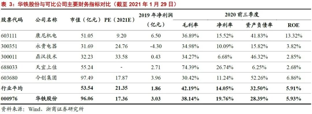 从与可比公司横向比较的角度来看,截至2021年1月29日可比公司康尼机电(轨道交通门系统)、永贵电器(连接器)和鼎汉技术(轨道交通电源)、天宜上佳(粉末冶金闸片)和今创集团(门系统、座椅和厨房等)2021年Wind一致预期预测的平均PE为21倍,我们对华铁股份2021年预测PE为17倍,低于可比公司的平均水平。