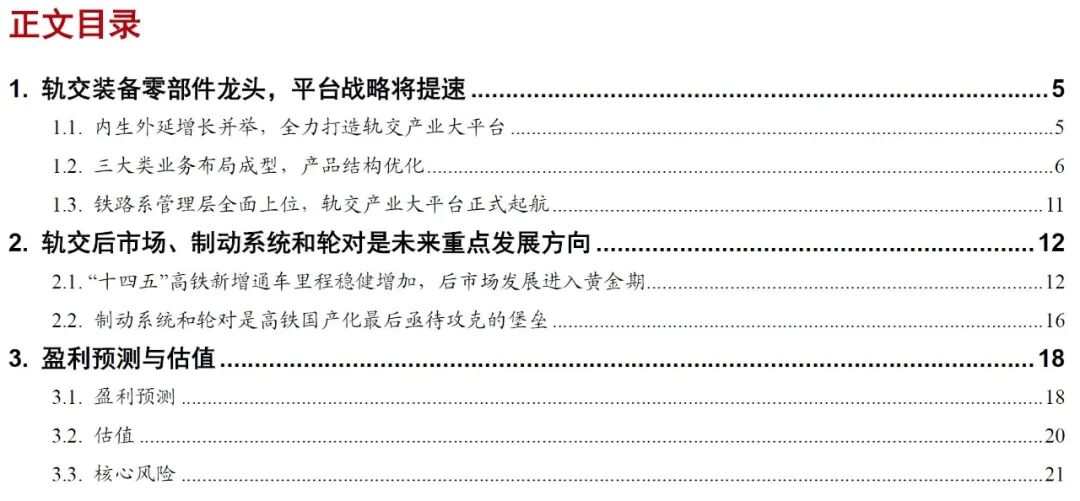 投资要点 三大类业务布局成型,产品结构持续优化 公司为轨道交通车辆装备制造核心零部件平台化公司。子公司青岛亚通达、华铁西屋法维莱、全通达、山东嘉泰生产十余种轨道交通装备制造核心产品,形成了能源与舒适、制动与安全、智能与服务三大类方向布局,其中核心业务给水卫生系统、备用电源和高铁座椅领域在国内市占率均超50%。 公司发展方向对标国际成熟轨交零部件制造企业德国克诺尔,目前公司市值较德国克诺尔仍有较大成长空间,预计未来产业布局加速,盈利有望持续提升。 “管理层换新+优质并购”,公司轨交产业大平台布局渐成 公司精准并购行业优质资产,与国际领先轨道交通企业展开合作,例如与西屋法维莱成立合资公司;成为哈斯科铁路中国总代理;收购山东嘉泰切入高铁座椅领域。 零部件制造稳步增长+维保后市场需求提升,双轮驱动公司发展 动车组新增需求将趋于平稳,维保后市场需求逐步提升,零部件类需求稳步增长。近期国家发改委颁发《“十四五”综合交通运输发展规划》,确保京津冀、长三角、粤港澳三大区域的城轨建设规模达到年均2000公里水平。根据去年8月发改委提出的《新时代交通强国铁路先行规划纲要》,到2035年全国高铁通车里程7万公里左右,截至2019年底已通车3.5万公里,即未来16年年均通车2188公里,预计新增里程对应年均所需动车组数量在200-250组。动车组增量市场趋于稳定,但存量市场基数将持续扩大,且上一轮采购高峰期的车辆均步入大修期,庞大的设备保有量催生零部件后期维保更换需求,轨交后市场进入黄金发展期,零部件企业尤其是耗材类零部件企业将充分受益。 盈利预测及估值 公司打造轨交零部件大平台战略雏形已现,铁路系新管理层将会加速这一战略的推进。预计2020-2022年公司净利润4.5亿元、5.5亿元、6.5亿元,同比增长48%、23%、18%,对应PE为21/17/15倍。考虑到公司较强的盈利能力,以及轨交产业大平台战略的顺利推进,给予公司2021年25倍PE,对应目标价8.7元/股。首次评级,给予“增持”评级。 风险提示 |