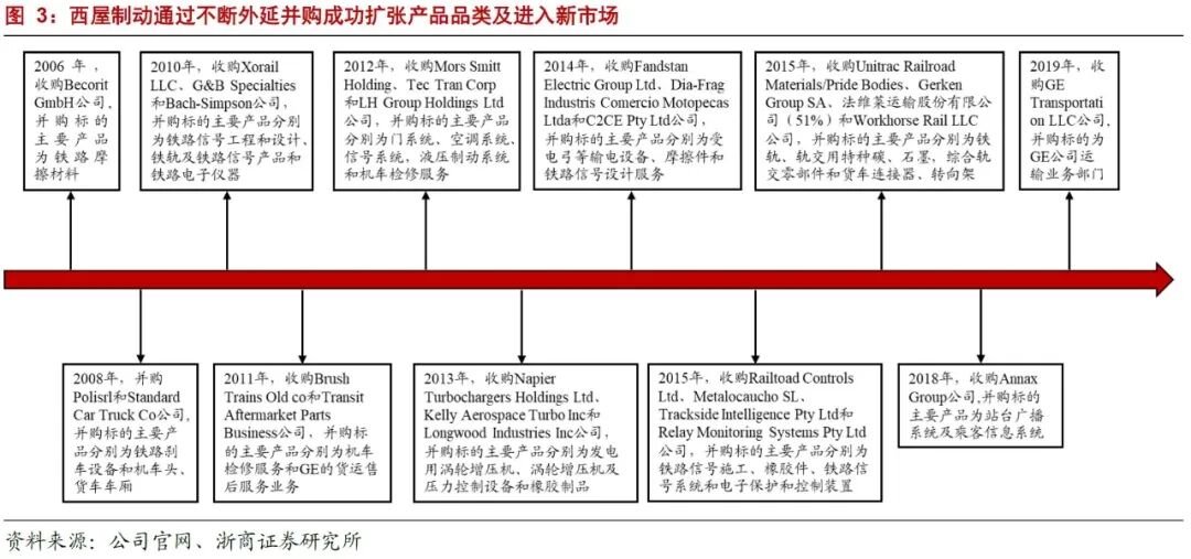 从国际经验来看,外延并购是打造轨交产业平台的主要方式。轨交产业的国际巨头克诺尔、西屋制动成长壮大的共同规律:1)生于轨交大国;2)发家于制动系统;3)不断通过外延并购实现公司产品品类的扩张并以此打造轨交产业大平台。