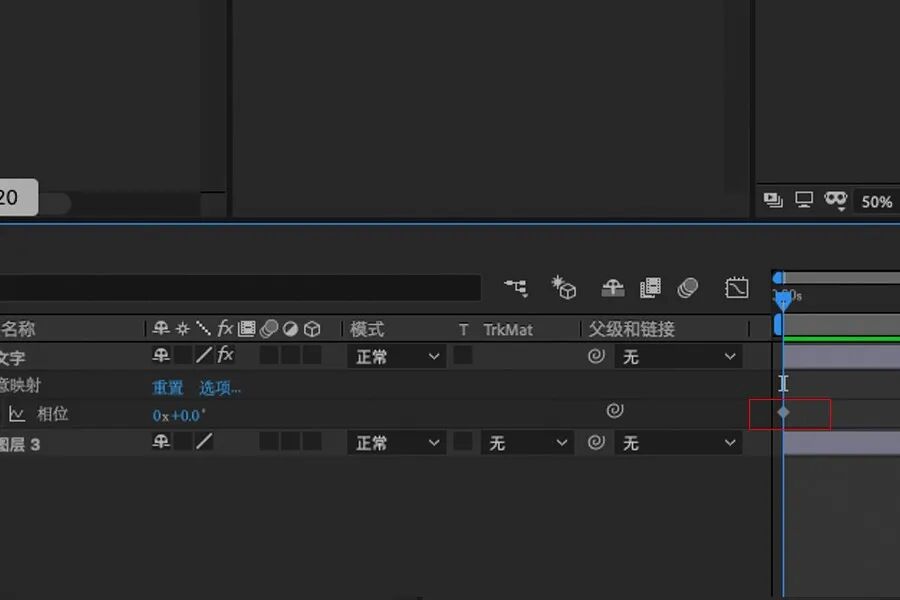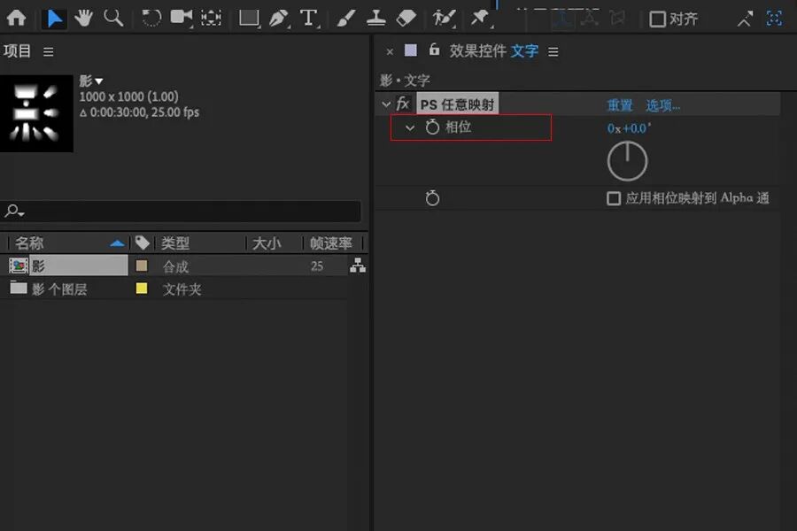 在效果控件中,找到任意映射下的相位选项。点击前面的小码表图标,打一个关键帧。