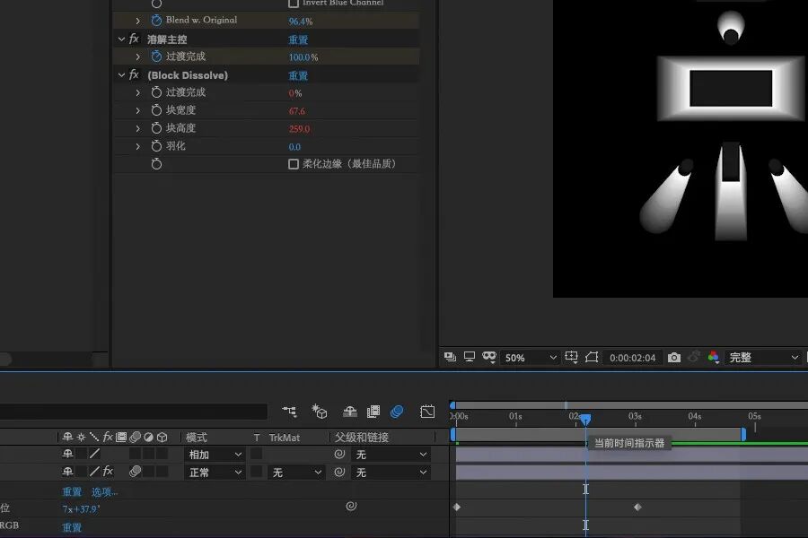 最后,找到“块溶解-数字化”这个效果,它是一个渐入的动作,使字体不会直接突兀的出现,同时这个效果也会产生错乱迷幻的韵律。