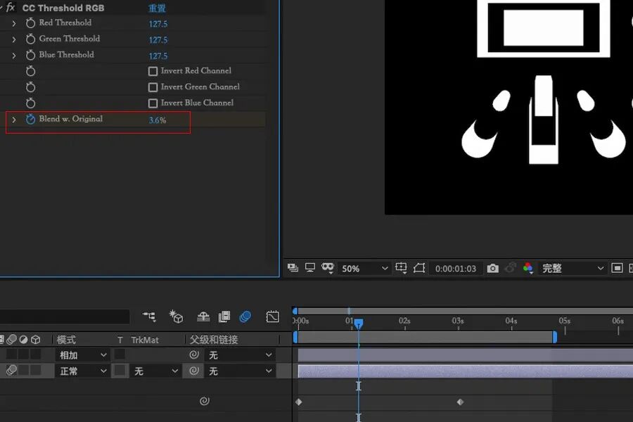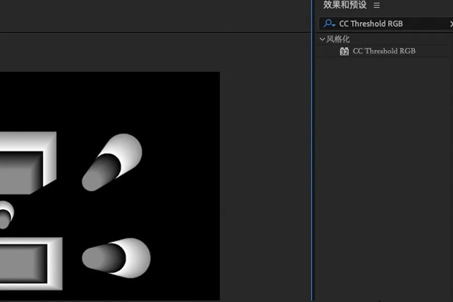 接下来我们找到CC Threshold RGB这个效果,并拖动到文字层应用。这个效果可以使原本渐变的字形变成单色,这样在从单色到渐变形式的过渡中,产生丰富的变化效果。