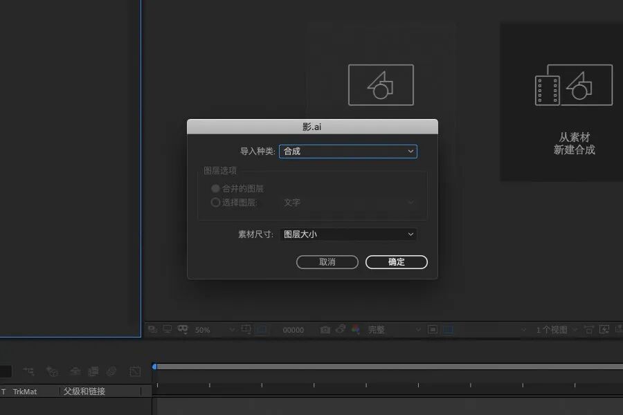 然后会弹出一个窗口,导入种类选为合成,素材尺寸选择图层大小。