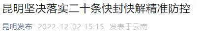 除此之外,昆明市应对疫情工作领导小组指挥部会议提出,要严格落实“二十条”,优化防控措施,科学精准划定高、低风险区,根据疫情变化及时动态调整临时管控场所,符合解封条件的将及时解封,