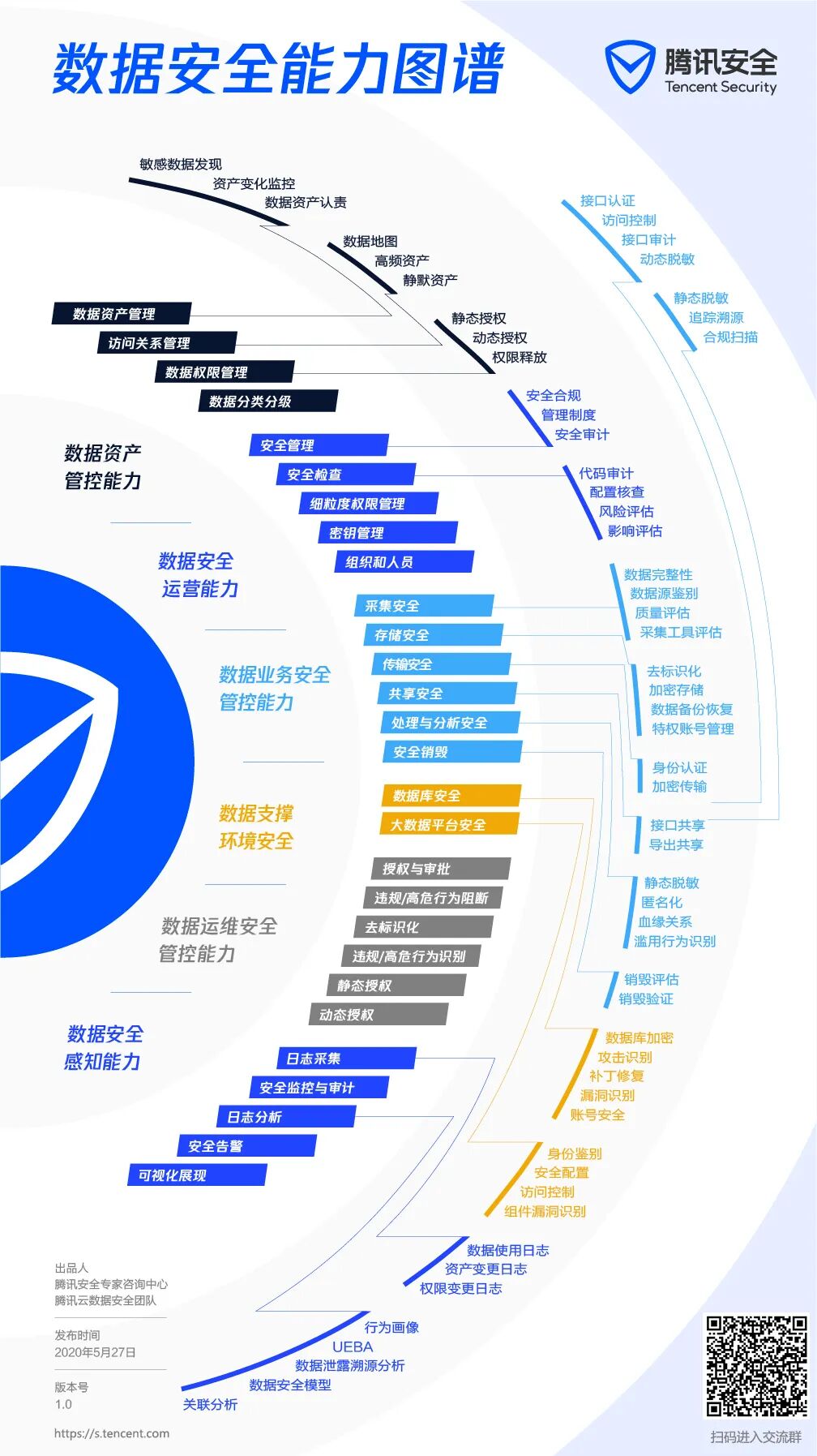 为了使企事业单位在开展数据安全体系建设时有所参照,解决建设前、中、后的顾虑和困惑。通过调研数据安全领域的技术和产品,以及各行业top级企事业单位的管理经验,腾讯安全结合自身的应用与实践经验,绘制并发布数据安全能力图谱,助力企业规划数据安全体系的建设、加强数据场景的安全管控能力、指导数据安全能力的评估等场景。 关注腾讯安全(公众号:TXAQ2019)