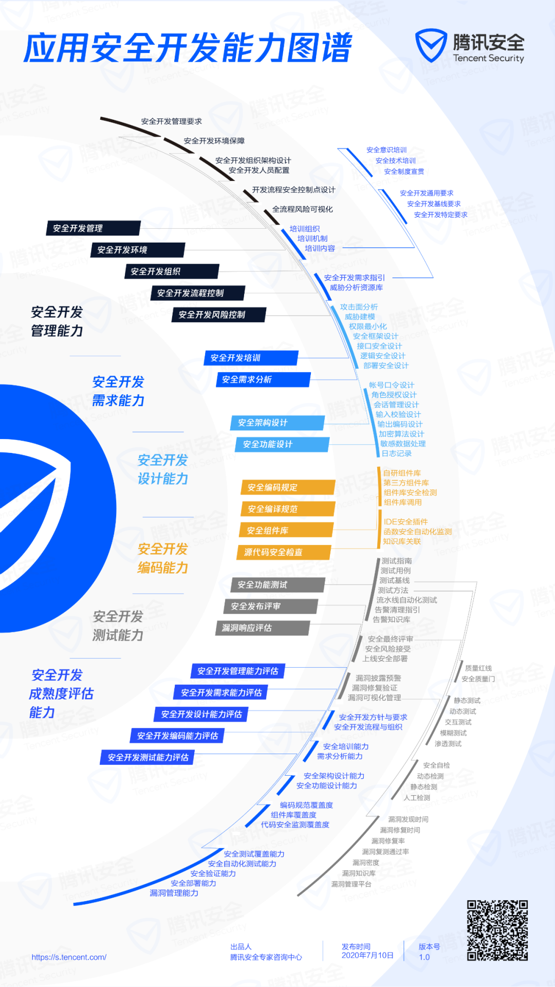 美国国家标准与技术研究所(NIST)评估,如果在应用系统上线之后进行软件漏洞修复,其修复成本是需求设计阶段修复成本的几十倍,所以应用软件的安全质量不仅仅是测试出来的,更是设计开发出来的。腾讯安全专家咨询中心从客户视角出发,结合腾讯内部应用安全开发的实践经验,针对企业用户如何设计开发建设应用安全开发体系,给出具体的能力清单和指导框架,汇聚成通用性的应用安全开发能力图谱,旨在帮助企业在产业互联网转型过程中提升应用软件安全质量,从源头降低安全风险。![]()