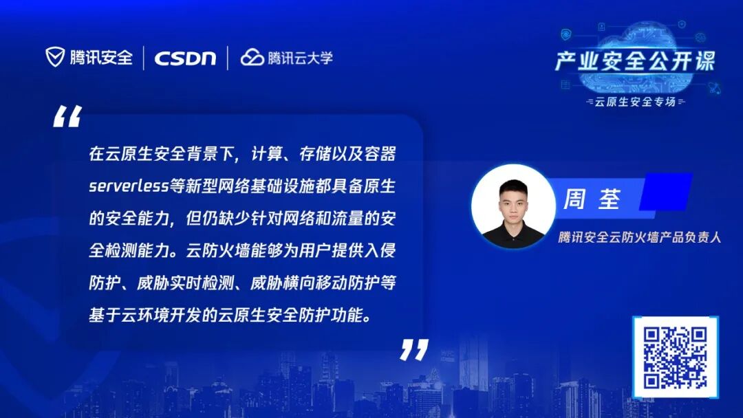 腾讯安全云防火墙产品负责人周荃从核心能力与用户价值出发,向用户充分展示云防火墙的产品细节,并详细介绍了如何通过云防火墙帮助用户实现业务上云,从而打造云原生安全体系、实现立体防护。