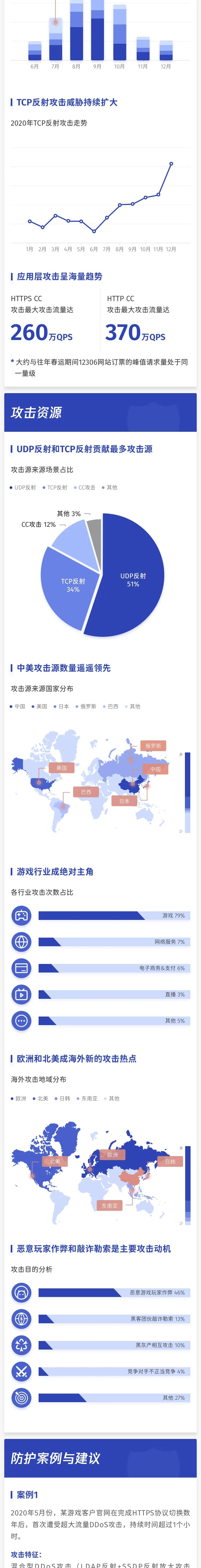 近日,腾讯安全发布《2020年DDoS威胁报告》,在回顾2020年重大DDoS攻击事件的基础上,对整体态势作了分析,并总结出几大趋势——攻击次数同比翻番、超大攻击连增两年、Q3攻击最为猛烈、海外攻击大幅增长、游戏行业攻击次数和占比均创新高。此外,《报告》还结合实际案例给企业防护DDoS攻击提供了实用性建议。