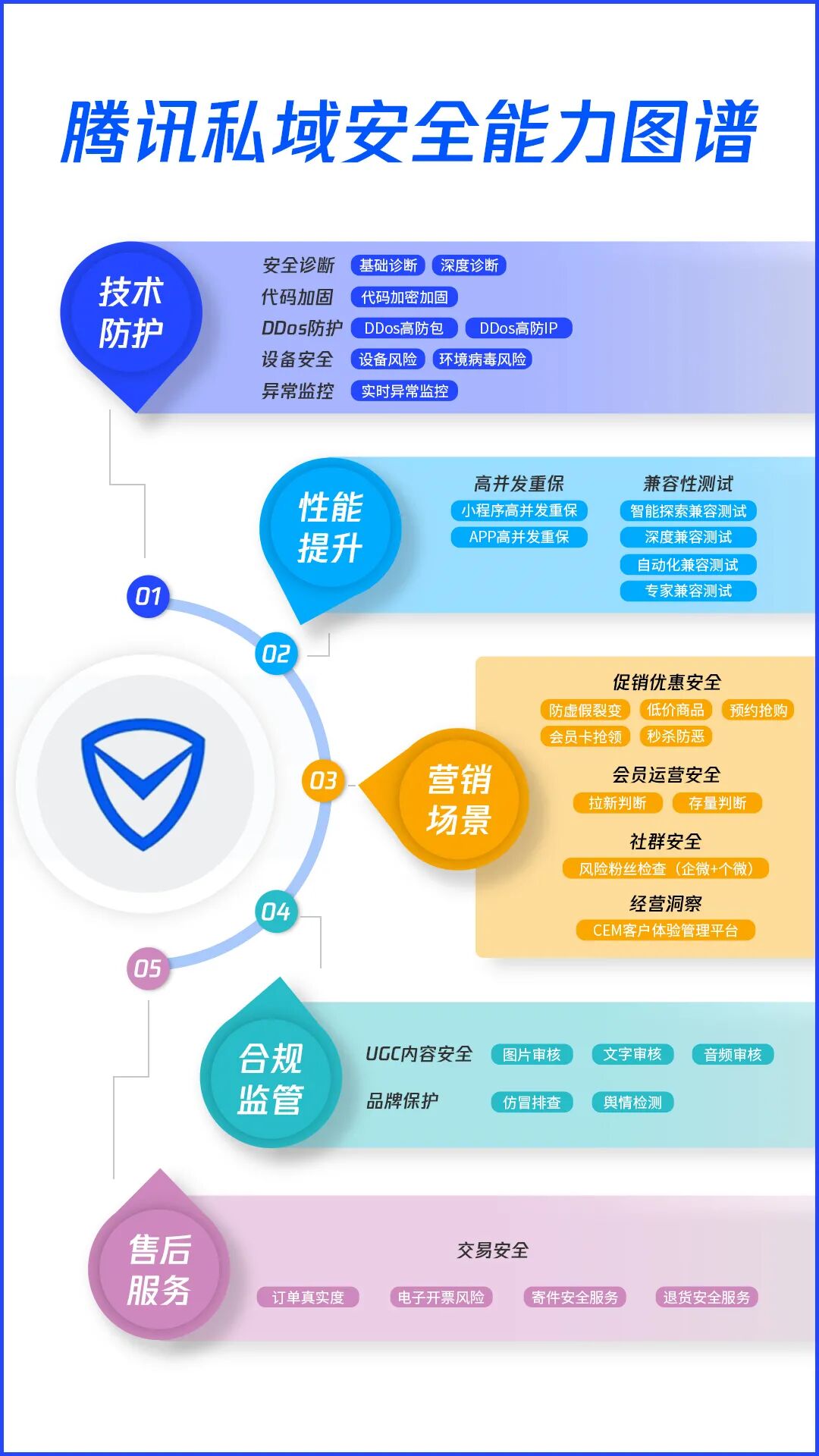 腾讯私域安全能力图谱包含五大能力模块:技术防护和性能提升两大售前模块,通过安全检测和性能测试,对业务系统进行漏洞检测,避免因系统漏洞造成安全风险;营销场景保护、合规监管两大售中安全模块通过会员运营安全、UGC智能审核等为促销活动安全、内容合规等提供保障;售后环节通过订单真实度、电子开票风险检测等确保交易安全。
