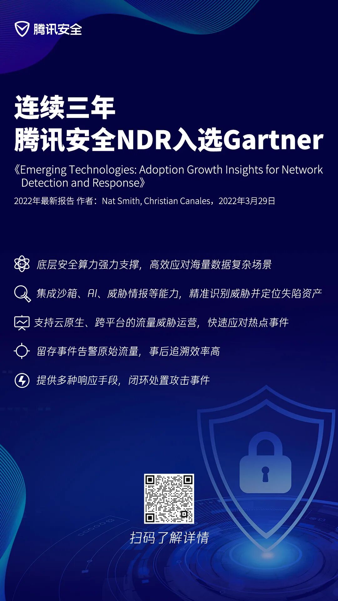 近日,Gartner发布2022年《Emerging Technologies: Adoption Growth Insights for Network Detection and Response》(新兴技术:网络检测与响应的采用增长洞察)的报告,汇集了全球30项NDR技术示例产品,腾讯安全作为案例厂商被列入其中。截至目前,腾讯安全已连续三年入选。