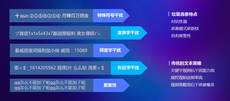 针对这类文本的特点,单靠抗干扰能力弱、策略更新滞后的文本策略无法满足对抗的需求,需要通过文本策略+算法模型相结合的方式来提升整体识别的召回率和准确率。