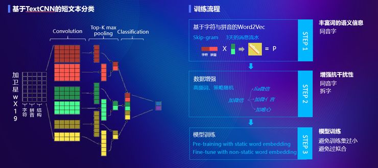 对比典型的TextCNN、RNN、FastText等文本分类算法,其中TextCNN的模型复杂度低、推理速度快、抗干扰性强且对词顺序不敏感等特点,适合于短文本高对抗的场景;在模型训练中通过以下手段来进一步提升模型的识别效果: