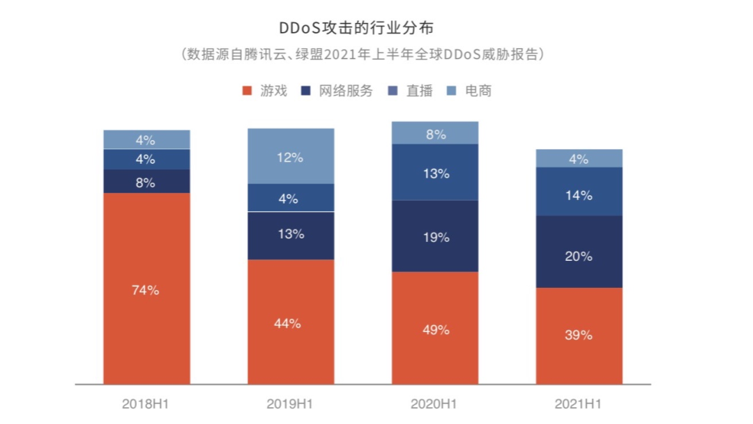 据《报告》分析,在行业低门槛、高竞争性、高利益特性的持续影响下,2021年上半年,游戏仍然是DDoS攻击最集中的行业,占整体分布的39%。值得一提的是,受疫情影响,在线医疗、在线教育、在线会议等新兴产业的兴起,使网络服务行业受攻击次数的占比逐年增加,直播、电商等行业也成为DDoS攻击的新目标,游戏行业的占比正在持续下降。