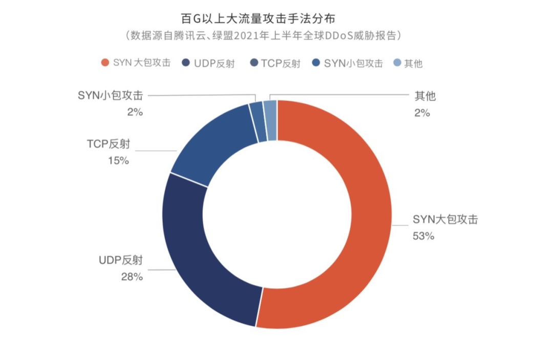 在攻击资源上,由于互联网上大量开放的TCP端口和大量家庭网络的暴露,导致 TCP服务器成为数量最大的DDoS反射攻击资源,受攻击次数、规模双双增长。根据《报告》,2021年以来,百G以上的TCP攻击屡见不鲜,包速率动辄数以亿计,对上下游网络设备、防护设备以及云端清洗服务的性能造成了严峻挑战。
