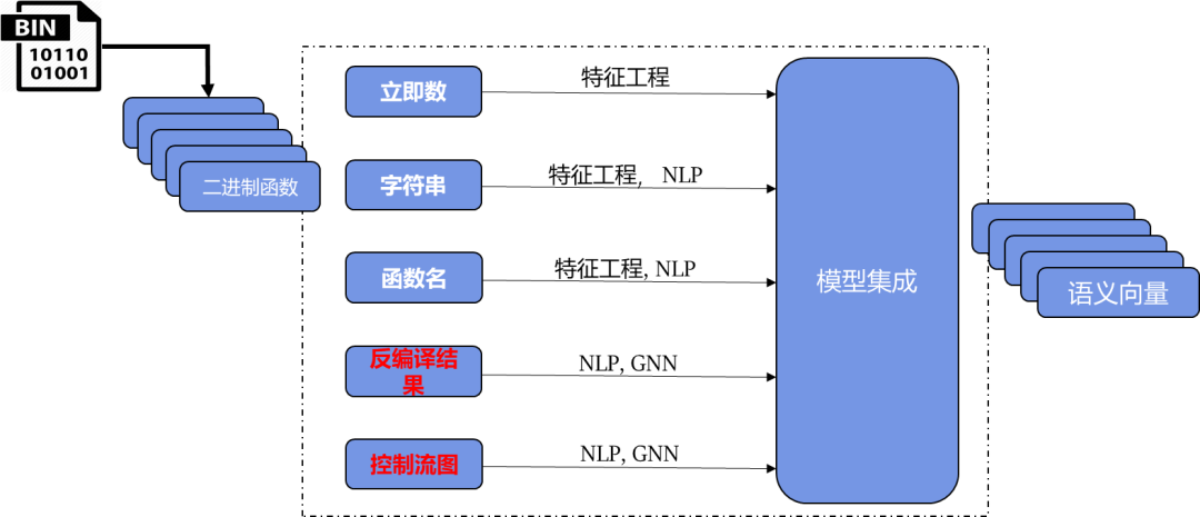 BinaryAI是利用深度学习算法,将函数表示成可以代表其语义的高维向量的技术。简单来说,BinaryAI技术就是把一个函数转换成一个向量,两个函数的语义相近或者一致的话,所对应的向量距离也很近。