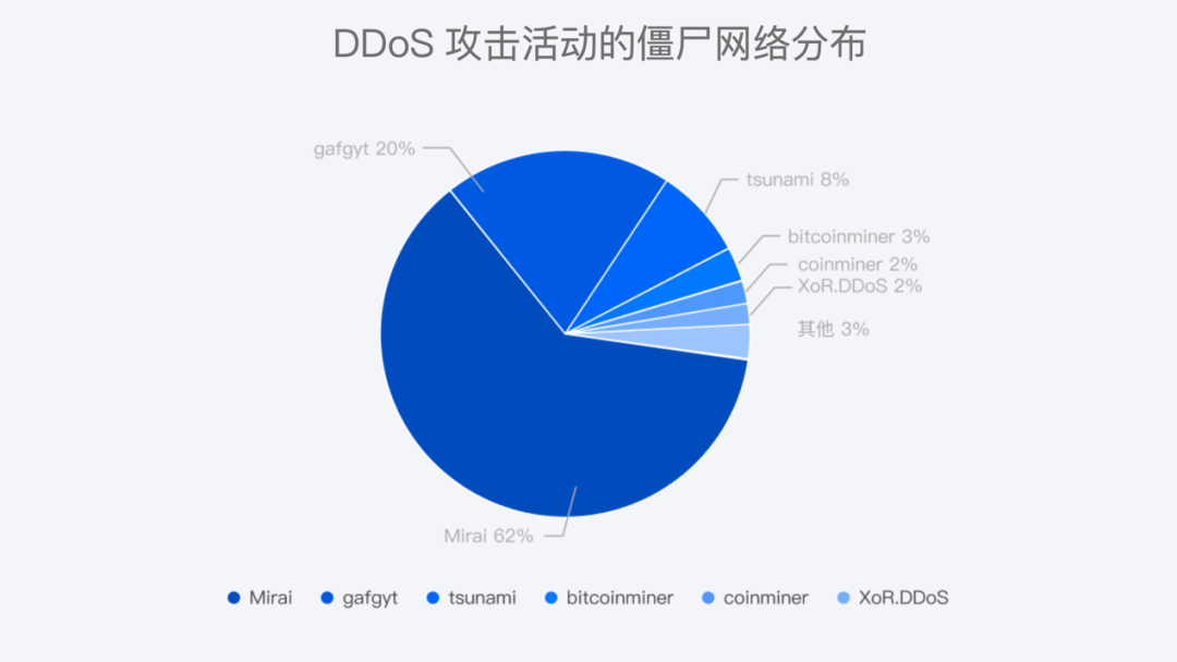《报告》还认为,无论是攻击指令的角度,还是发起的DDoS攻击次数的角度,Mirai僵尸网络都是上半年威胁最大的僵尸网络。2022上半年Mirai僵尸网络发起了超过6成的DDoS攻击,对近两年TOP20高危漏洞的利用率接近100%。同时,Mirai还拥有占据整体4成左右数量的肉鸡,比排在第二位的BillGates和排在第三位的Gafgyt的总和还要多。