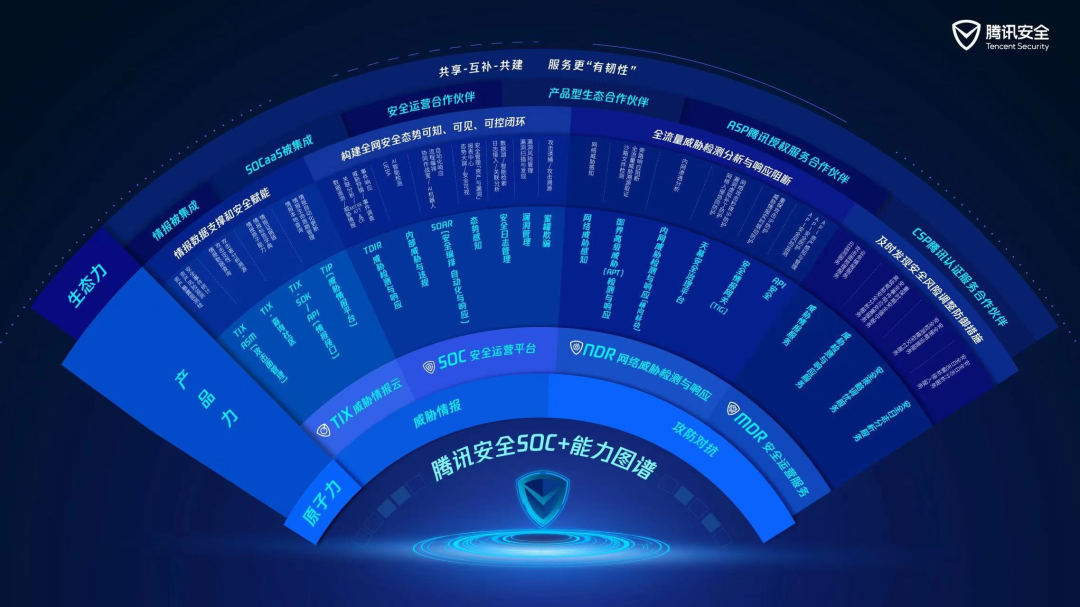“SOC+安全运营体系”是腾讯安全面向产业数字化转型推出的新理念,强调以威胁情报运营和攻防对抗为基础,构建起“情报-攻防-服务-生态”的闭环安全运营体系。目前,腾讯SOC+集成了TIX威胁情报中心、SOC安全运营平台、NDR网络威胁检测与响应、MDR安全运营服务四大产品矩阵,可支撑政企机构建立起技术、人员、流程一体化的安全运营体系,全面提升安全防护能力和安全运营效率。