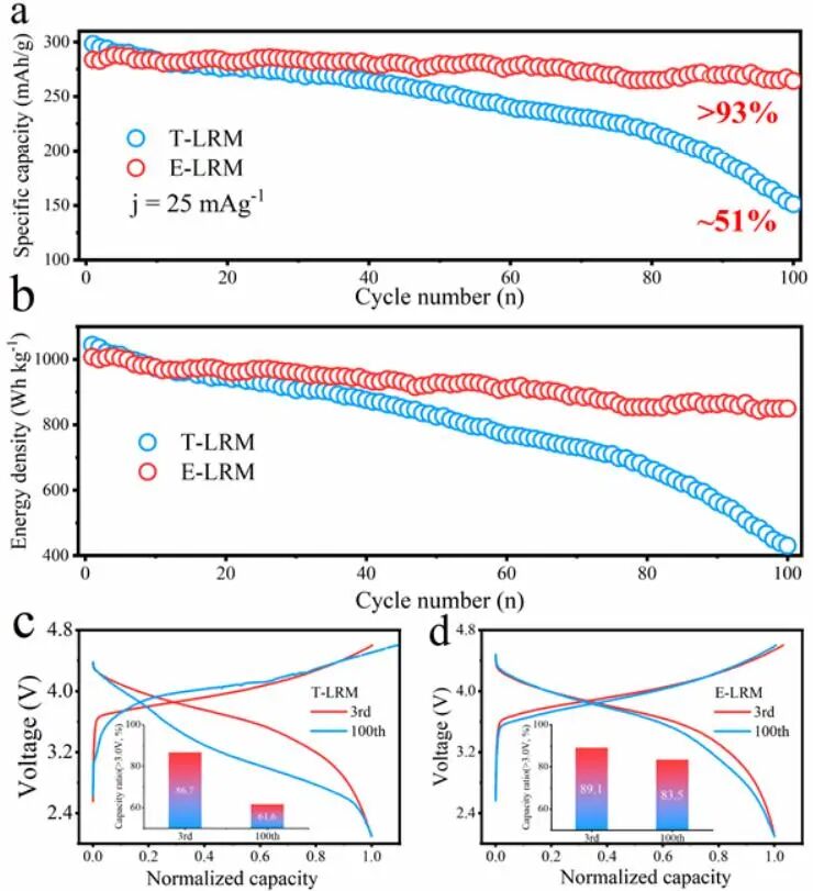 (T-LRM)。同时,E-LRM在3个月的循环测试中表现出优异的循环稳定性(0.1C,> 93%),容量保持率远高于T-LRM(51%)。