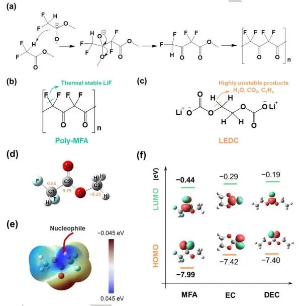 二氟乙酸甲酯(MFA)可通过克莱森酯原位缩合反应在Li负极表面形成富含聚合物的层。MFA的C=O基团是最低未占据分子轨道(LUMO),当Li金属被还原时,它接收来自Li金属的电子,产生可作为亲核试剂的碳阴离子。通过热分解产生的LiF表现出良好的热稳定性,以抑制Li金属和电解质之间的进一步反应。二氟取代使碳(C1)带更多正电荷,α-氢更易受到亲核碳阴离子的攻击。MFA分子中的F原子取代增加了其氧化稳定性,有助于抵抗与阴极分解产生的氧的反应。MFA的最高占据分子轨道(HOMO)低于酯溶剂,表明MFA更具抗氧化性。