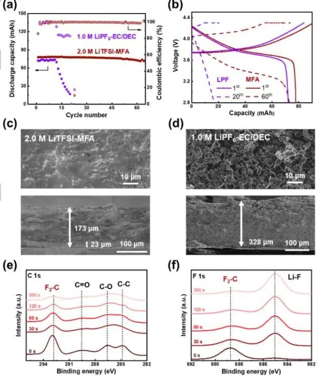 -EC/DEC)的循环寿命为12次循环。同时,均匀致密的聚合物可抑制Li枝晶的生长和Li的消耗。深度XPS测试表明,在电解质侧附近形成聚合物层,在Li金属侧附近形成高含量LiF。在Li负极表面由MFA原位生成的聚合物,可有效地抑制Li的粉碎,有利于改善LMBs的电化学性能。
