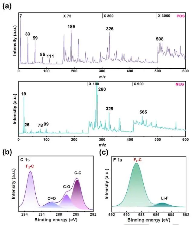 C下加热10 min,也能保持良好的结构完整性。加热处理后,通过质谱(MS)证实了MFA的双分子缩聚产生了Li金属表面产物。同时,证实了MFA可进一步缩聚以形成更高分子量的聚合物,有利于避免Li金属与电解质的进一步反应,从而产生副产物和巨大的热量。随后的XPS测试显示出F