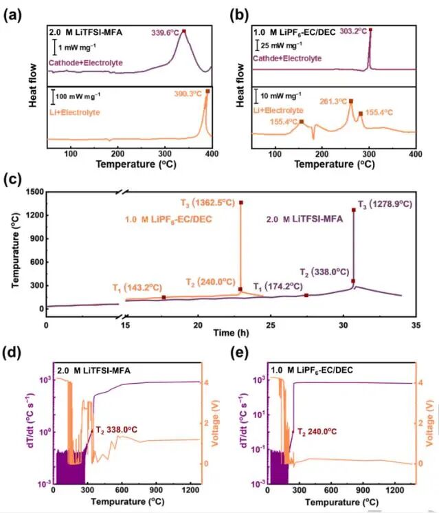 表明,使用MFA电解质的LMBs的热失控是由正极分解产物氧与电解质间的反应引起,延缓了Li金属与常规电解质造成的热安全风险,而400