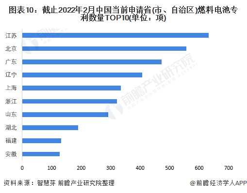 中国方面,江苏为中国当前申请燃料电池专利数量最多的省份,累计当前燃料电池专利申请数量高达633项。北京、广东、辽宁、上海和浙江当前申请燃料电池专利数量均超过300项。中国当前申请省(市、自治区)燃料电池专利数量排名前十的省份还有山东、湖北、福建和安徽。