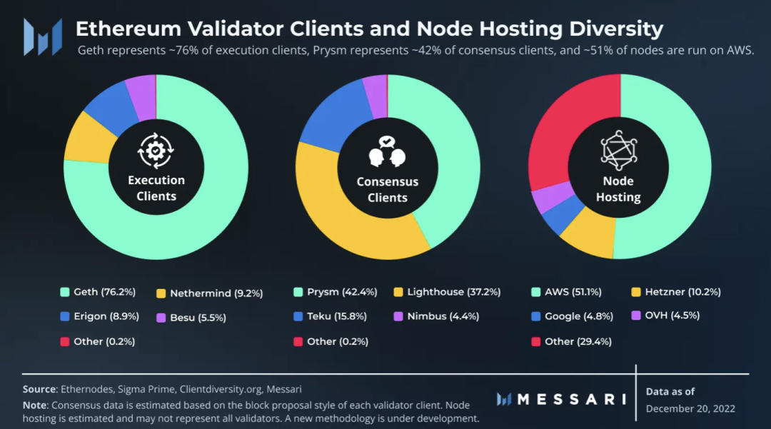以太坊验证器运营商对于他们用来运行验证器的组件有很多选择。正如我们之前在分布式验证器技术 (DVT) 分析中提到的那样,Prysm 估计占验证器客户端使用量的 42%,Geth 占执行客户端使用量的 76%,AWS 托管 51% 的以太坊节点。