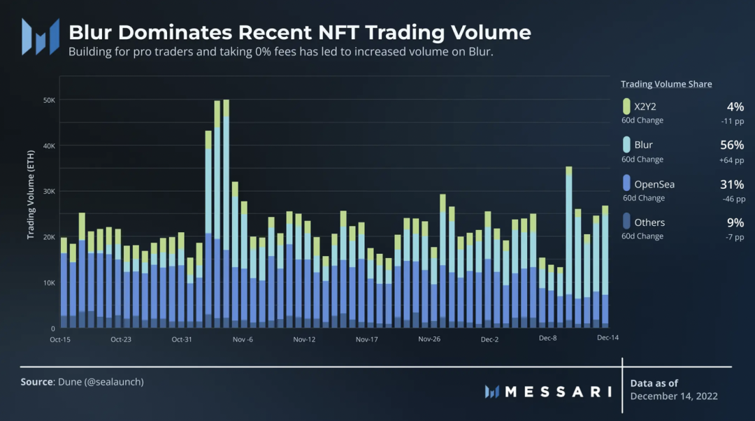 自 10 月推出以来,Blur 迅速成为 NFT 交易量的主导,取代了 OpenSea;