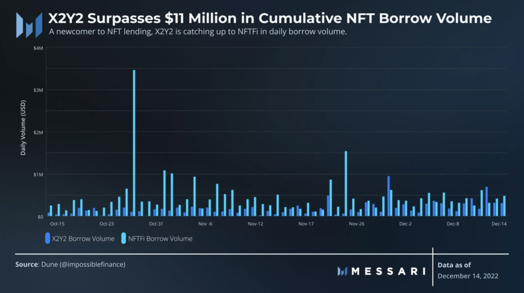 10月,X2Y2 在其平台上推出了借贷产品。有了它,用户可以为 ETH 抵押 NFT。结果:借款量稳步增加。尽管迄今为止 NFTFi 已经处理了超过 8000 万美元的借贷量,但 X2Y2 的日借贷量正在迎头赶上(累计 1100 万美元)。