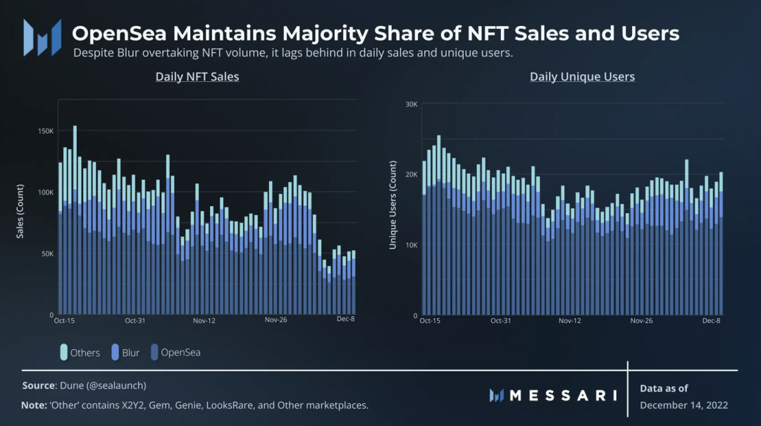 尽管交易量有所下降,但 OpenSea 仍保持着 NFT 销售额(52%)和独立日用户(68%)的大部分份额。虽然 OpenSea 仍然是大部分新入场NFT 用户的选择,但 Blur 的架构使其与众不同,成为了专业交易员的新宠。
