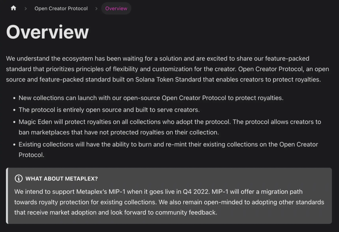 现在,领先的平台 Magic Eden、Metaplex 和 Cardinal 都宣布了一种协议级别的创作者版税保护形式。钟摆已经摆到了另一端,有几种设计使创作者能够禁止不强制使用费的市场。从长远来看,时间会证明哪种设计胜出。
