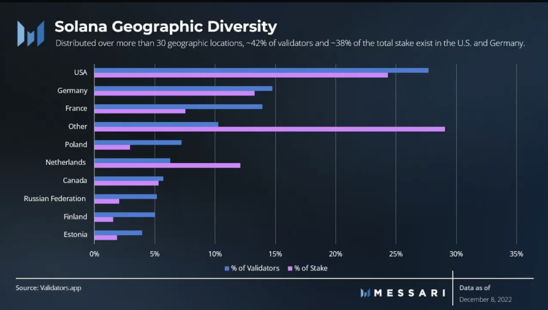 地理集中是第 1 层网络的典型特征,也是 Solana 旨在解决的一个问题。由于地缘政治风险、法规和自然灾害等原因,同一地点的太多验证者可能会危及网络的健康。