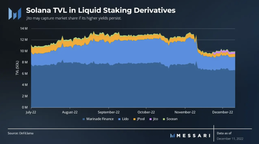 Jito Labs 的 JitoSOL 可能占据了所有的头条,但 Marinade 和 Lido 在市场份额方面仍然遥遥领先。如果 JitoSOL 的更高收益率(截至 12 月 7 日,Lido 为 9.10%,Lido 为 8.80%,Marinade 为 8.08%)持续存在,这种情况可能会改变。