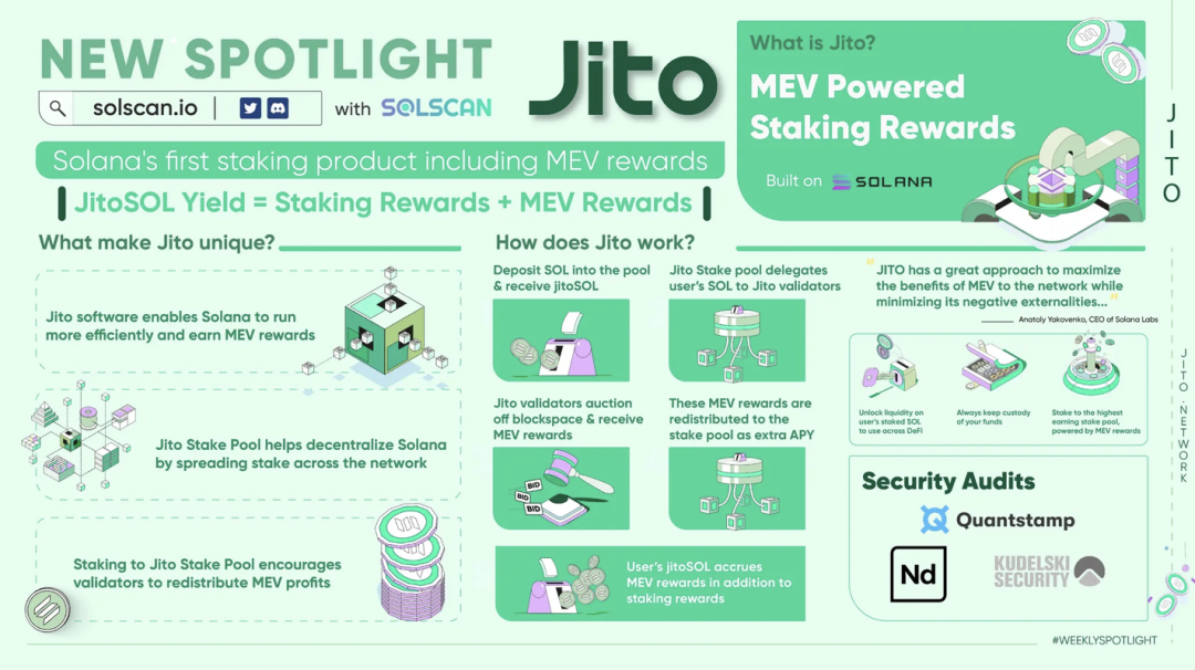 Jito-Solana 是 Jito Labs 改进的验证器客户端,以类似于 Flashbots 在以太坊上的 MEV-boost 的方式优化以促进 MEV。客户通过为受 MEV 影响的区块空间引入特定市场,为 MEV 创建更有效的市场。与 Jito-Solana 一起使用的是 JitoSOL 流动性质押衍生品,这将使运行 Jito-Solana 的验证者可以选择(但不是义务)在质押奖励之上自动将 MEV 利润分配给 JitoSOL 池。