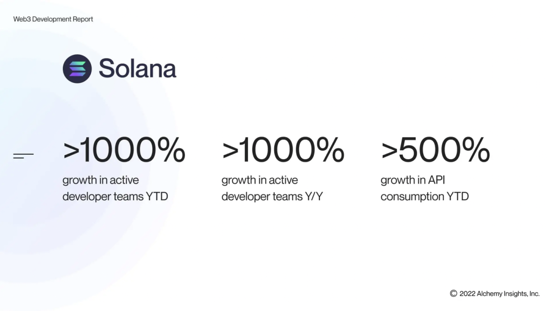 Alchemy 发布了一份 Web3 开发者报告,反映了与上述类似的增长故事。根据该报告,今年迄今为止,Solana 的活跃开发团队增长了 10 倍以上,API 消费增长了 5 倍以上。