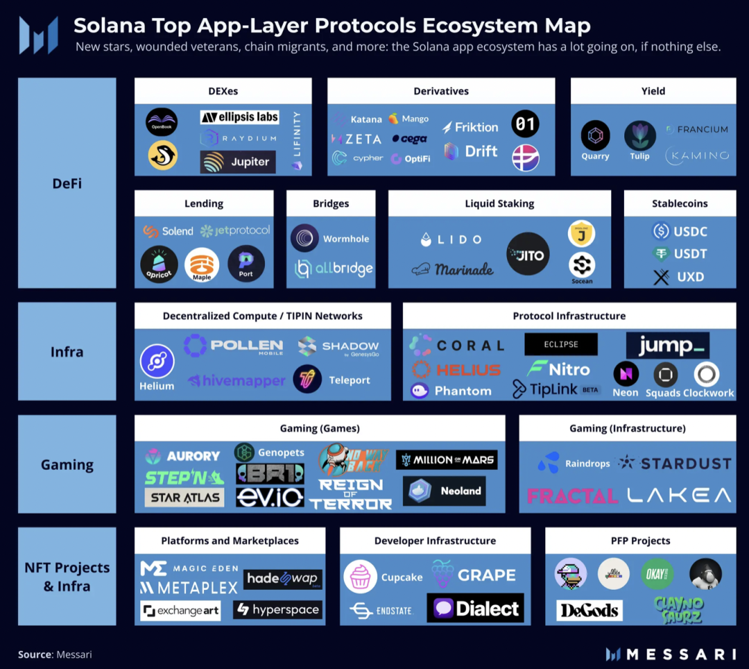 如果没有在其之上构建的应用程序,那么最好的技术也无足轻重。 Solana 在 DeFi、Web3 基础设施、NFT 和游戏方面拥有广泛的应用程序——太多了,无法在本报告中重点介绍每个项目。相反,我们创建了一个生态系统地图,涵盖了每个子领域的大多数名称以及每个子领域的顶级项目和叙述的亮点。