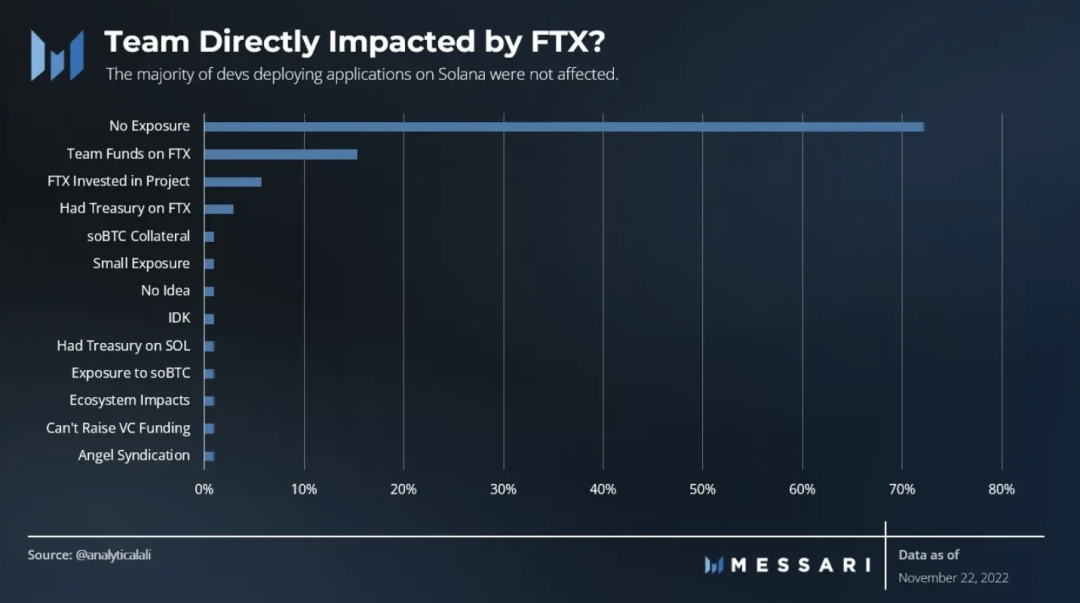 大约 72% 的开发者报告说他们的团队完全没有受到 FTX 的影响。大约 20% 的人将个人或项目资金投资于 FTX。
