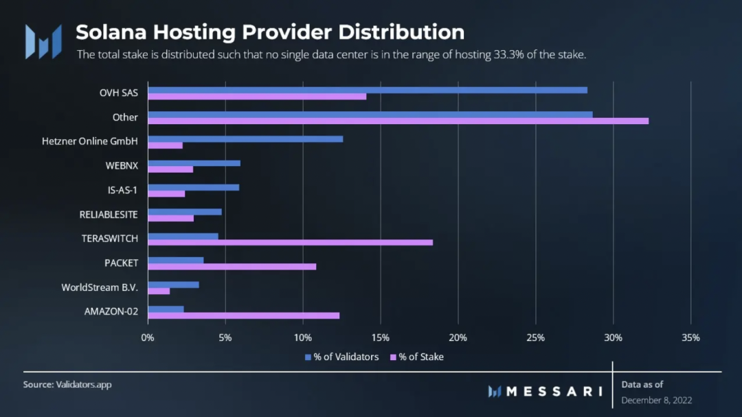 11 月初,Hetzner 删除了其服务器上所有与 Solana 相关的活动,并声明其政策禁止将其服务器用于加密相关活动。好在浓度还不足以让网络中断。尽管如此,该事件还是证明了网络过于集中在单一地理位置和数据中心的潜在风险。