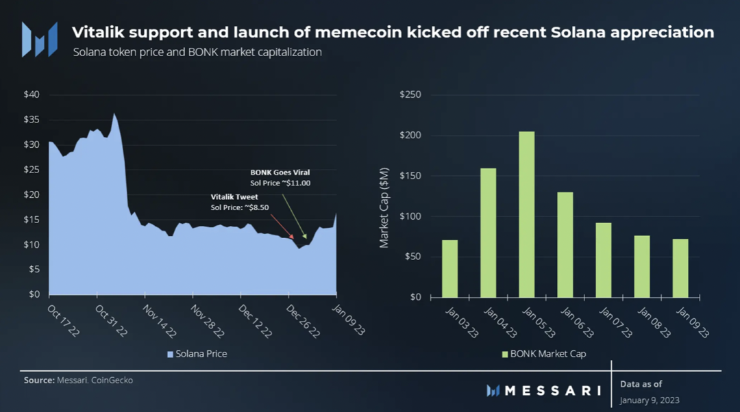 好吧,不幸的是,事实也并非完全如此。最近反弹的更可能原因似乎是来自 Vitalik 的支持性推文以及新的以狗狗为主题的 memecoin 的推出:BONK。该代币于12月下旬推出并迅速走红。受 Dogecoin 和 Shiba Inu 的启发,该代币的流通市值在1月9日曾超过2亿美元,随后跌破1亿美元。