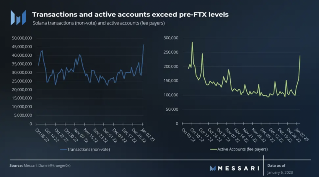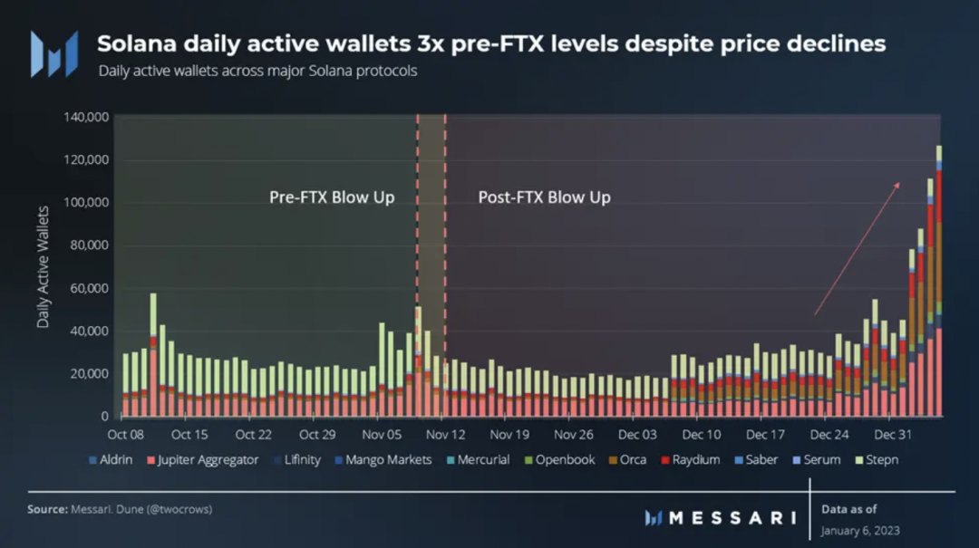 尽管许多人认为 Solana 活动在 11 月 FTX 崩溃后有所下降,但在主要 Solana 协议上交互的每日活跃钱包数量在 FTX 后保持不变。在过去的几周里,交易活动比 FTX 之前的水平增加了两倍。关于这个新的交易量水平的粘性如何,这当然是一个悬而未决的问题,但至少,与 FTX 退出生态系统前的交易量水平保持一致是一个积极的迹象。
